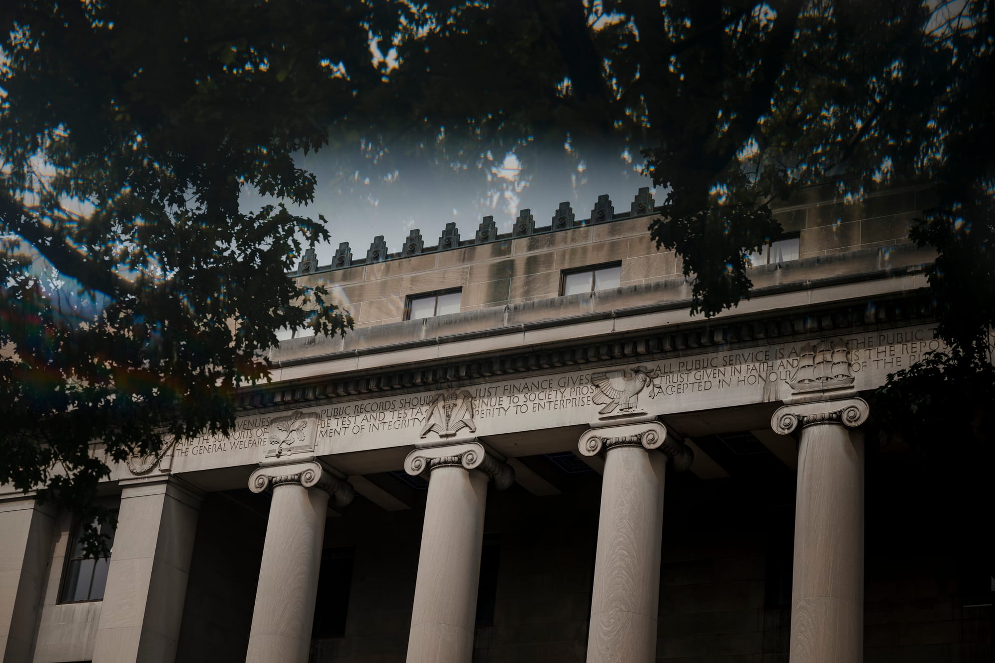 Left: An American flag on 3rd Street in Harrisburg. Right: Pennsylvania State Capitol.