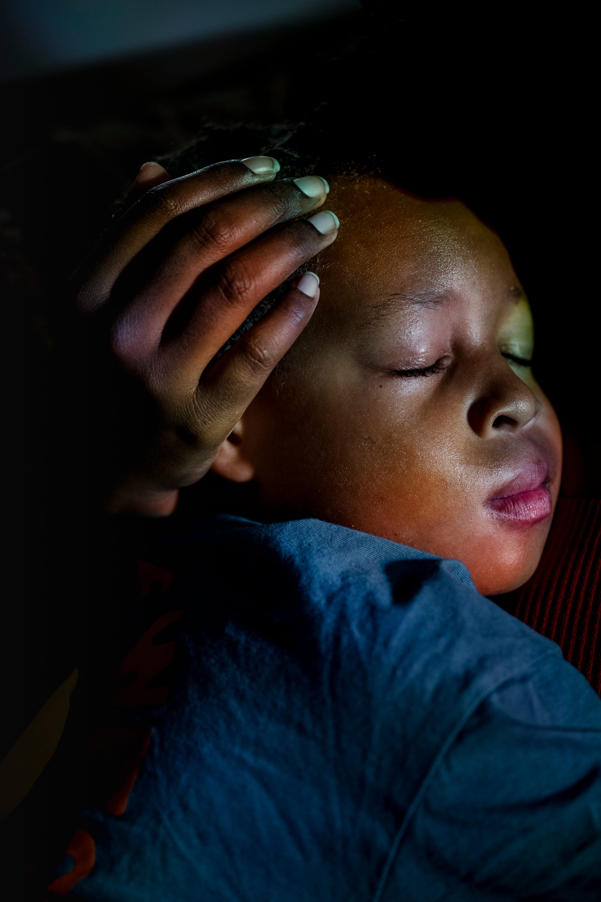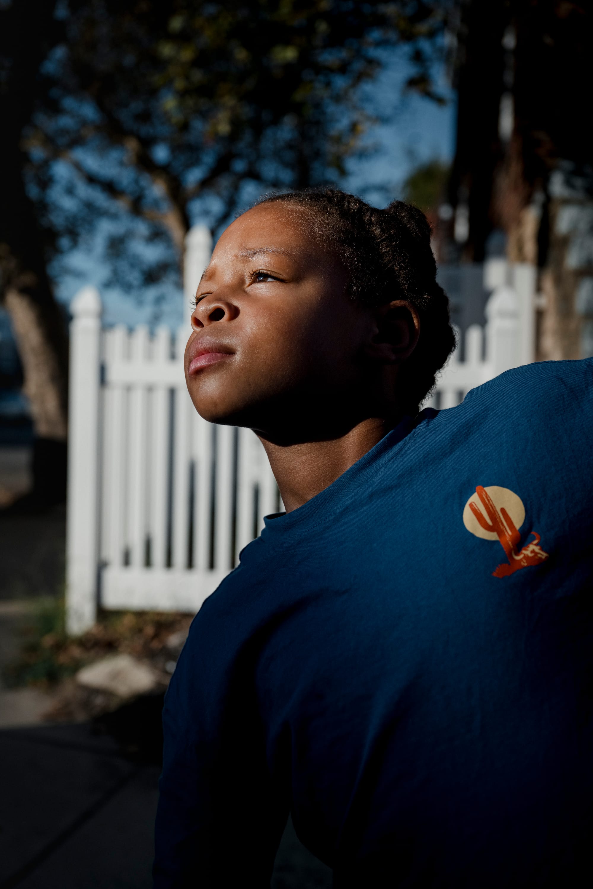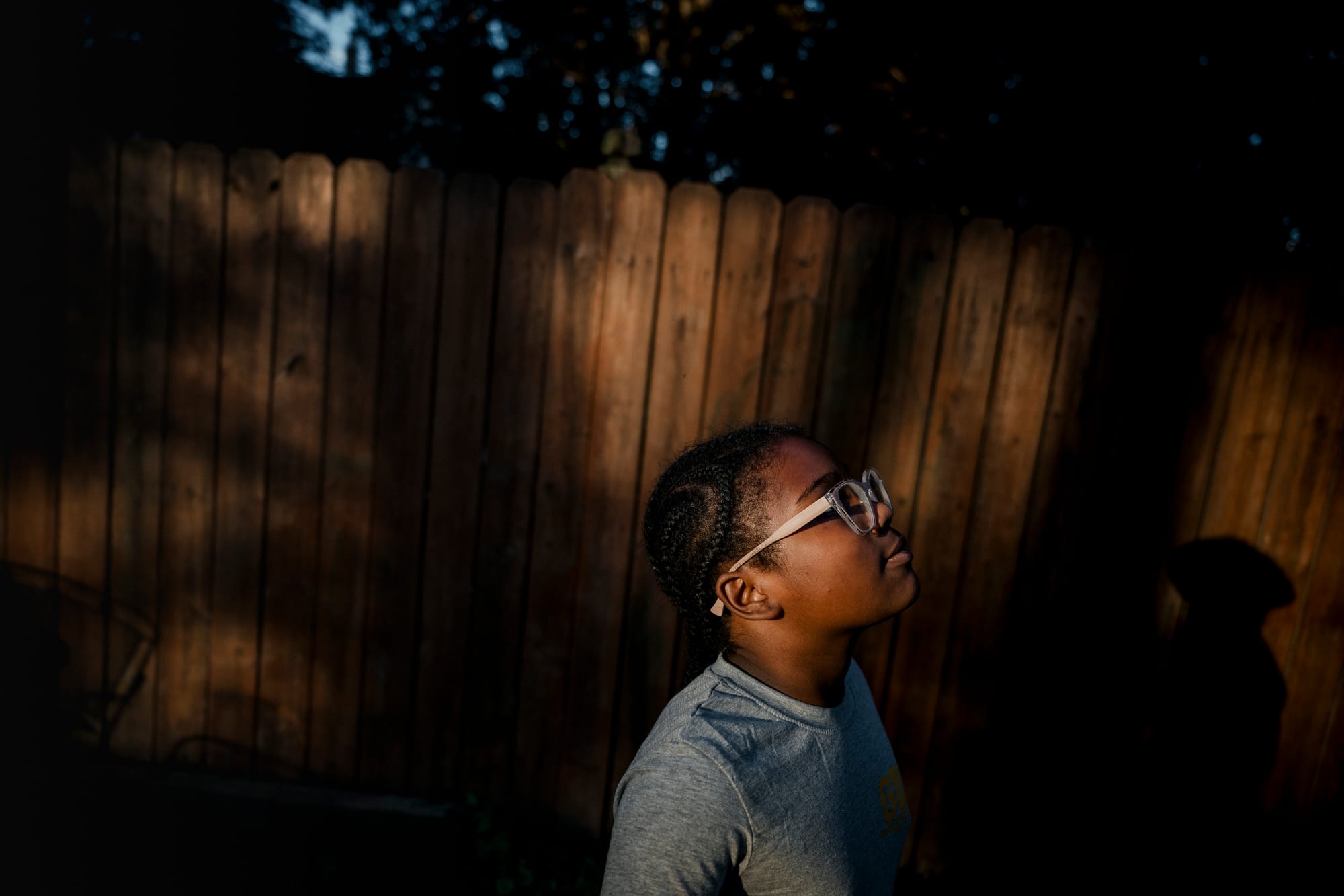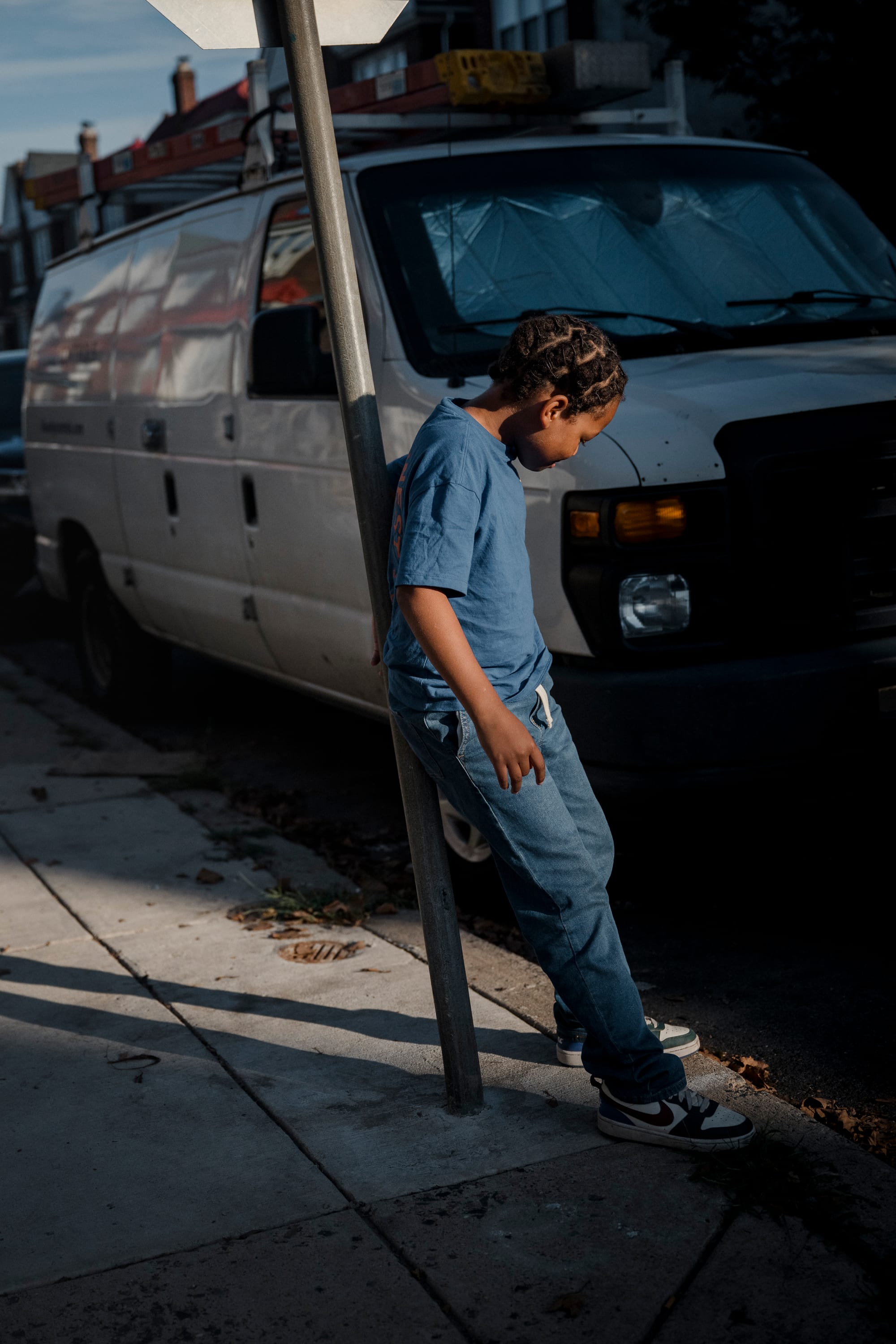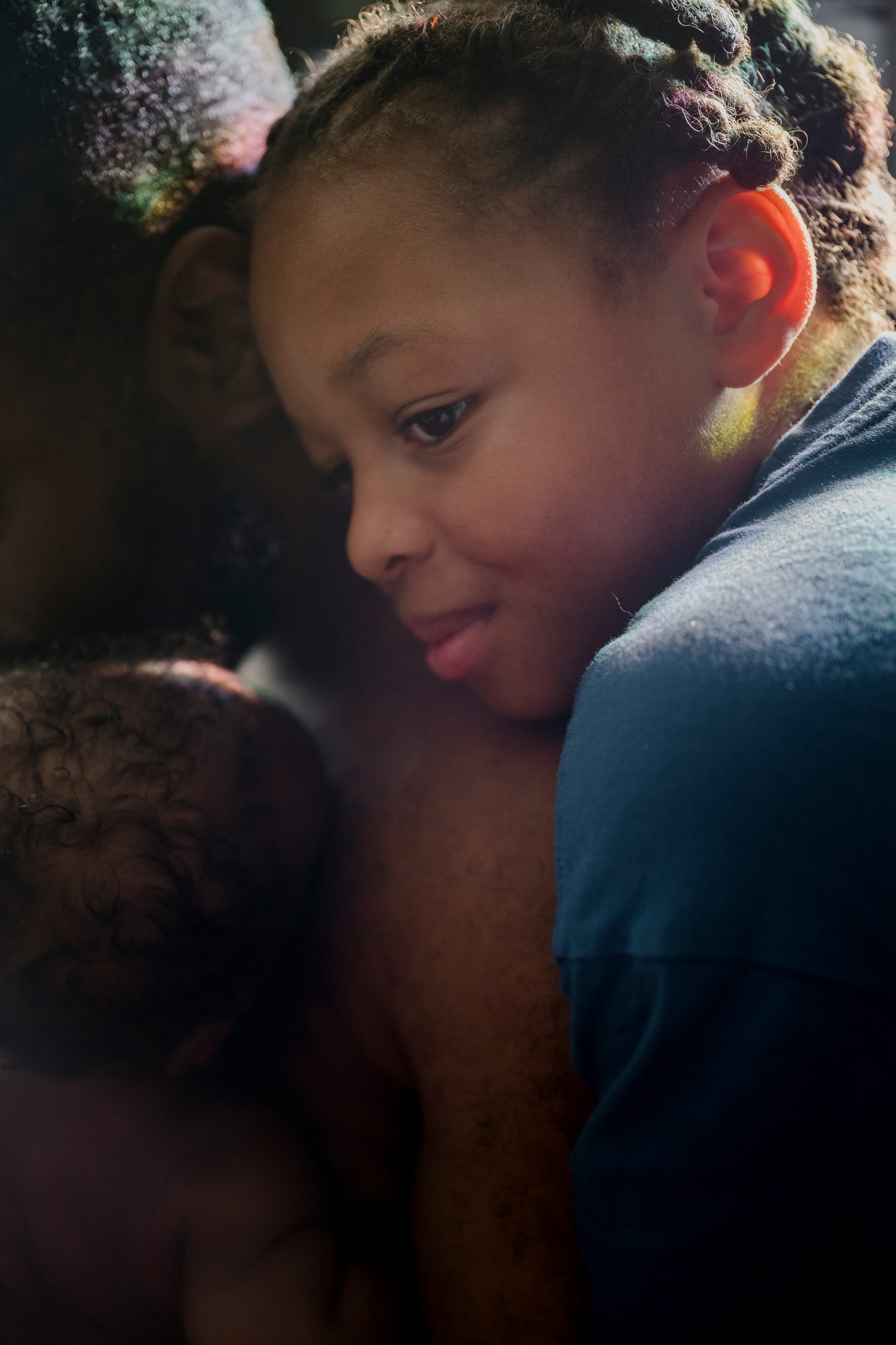 Left: Domonique Burton, 8, held by his mother, Victoria Moon, at their home in Philadelphia, PA, on Thursday, October 2, 2025. Center: Domonique with his family. Right: Domonique Illuminated by sunlight in his West Oak Lane neighborhood.