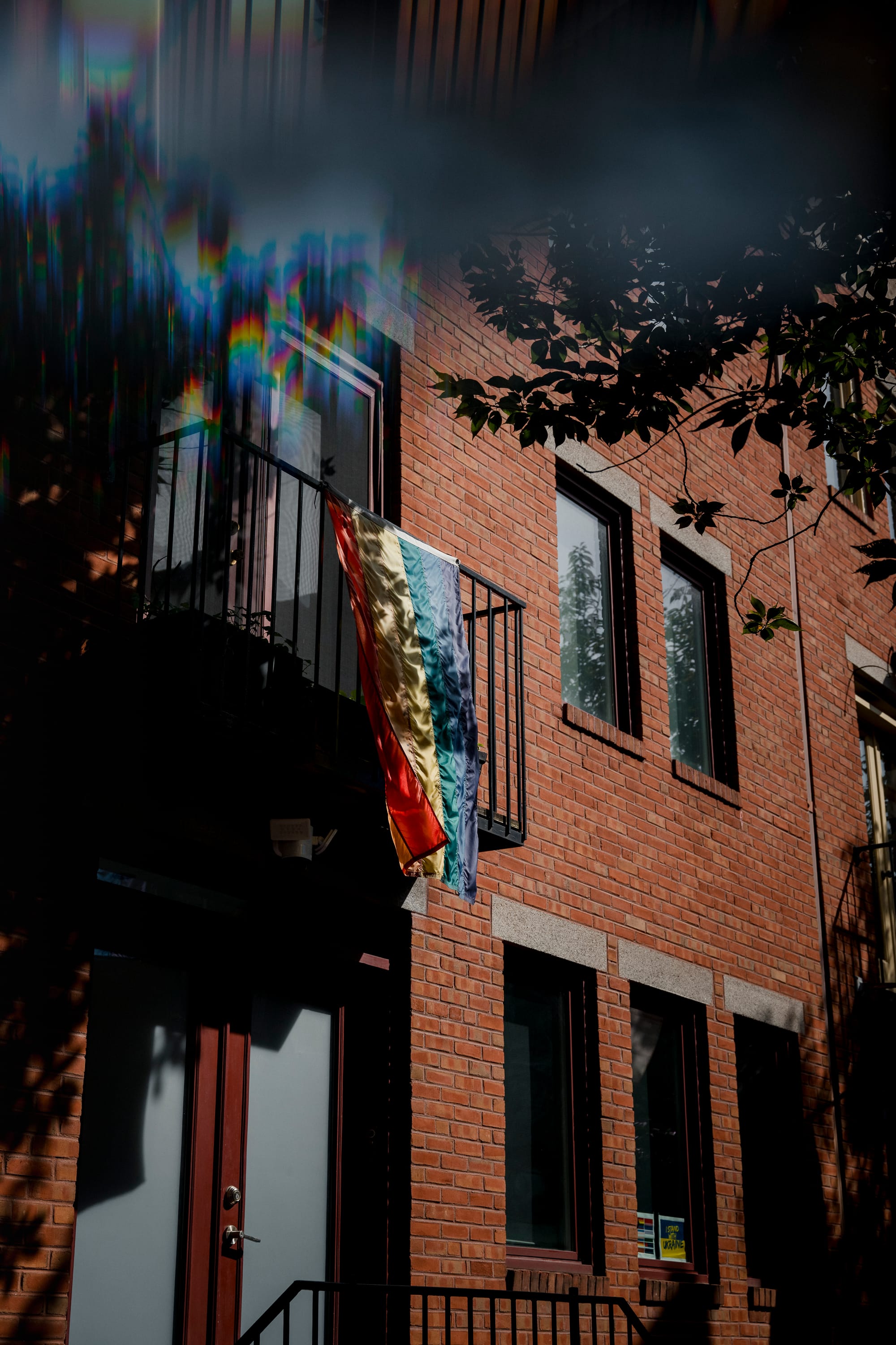 Left: A pride flag hangs in the Gayborhood neighborhood in Philadelphia, on Friday, October 3, 2025. Center: Chantel Carden in the Germantown neighborhood in Philadelphia, on Thursday, October 2, 2025. Right: An election sign regarding Pennsylvania’s Supreme Court judges sits on Stenton Avenue in Philadelphia, on Monday, October 6, 2025.
