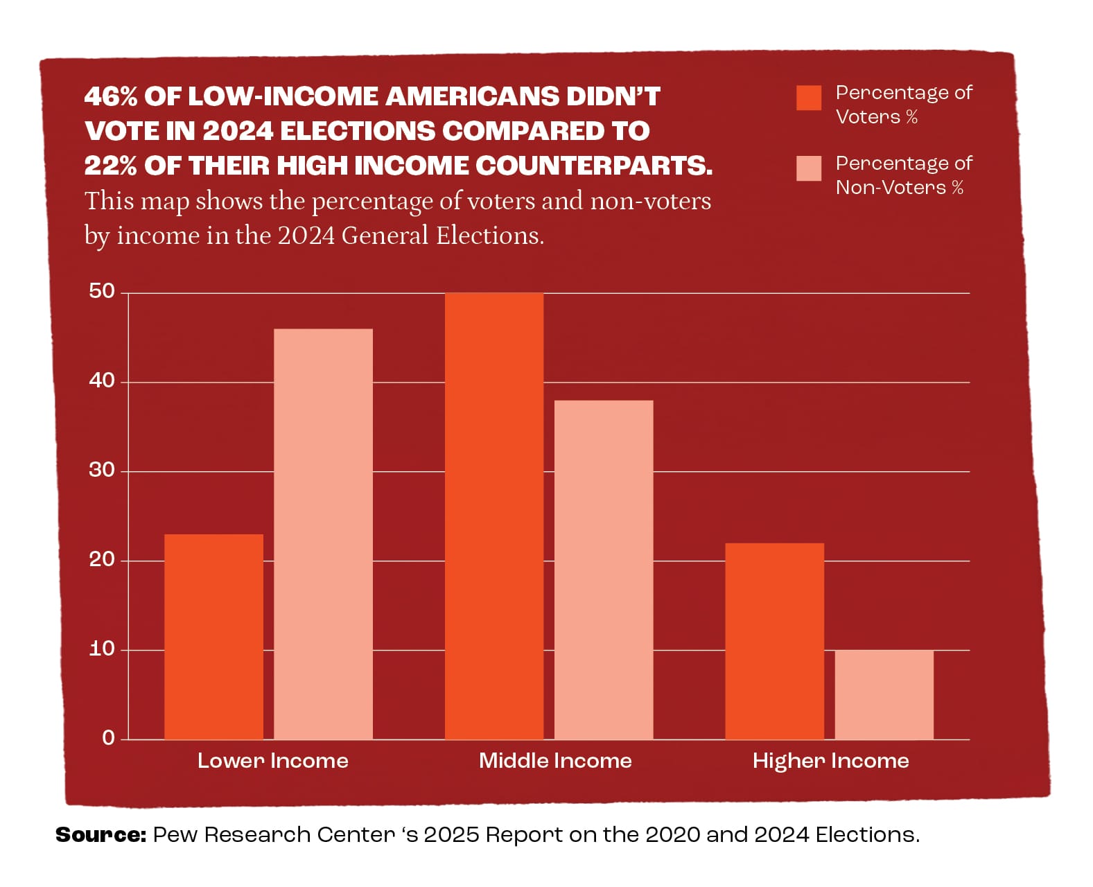 Earlier this year, Pew Research Center released a report on voter turnout from 2020-2024. In 2024, 46% of low-income eligible voters didn’t vote, which is down from 50% in 2020. Twenty-seven percent of people named scheduling conflicts as the reason they didn’t vote in a 2022 US Census survey on the Midterm Elections.