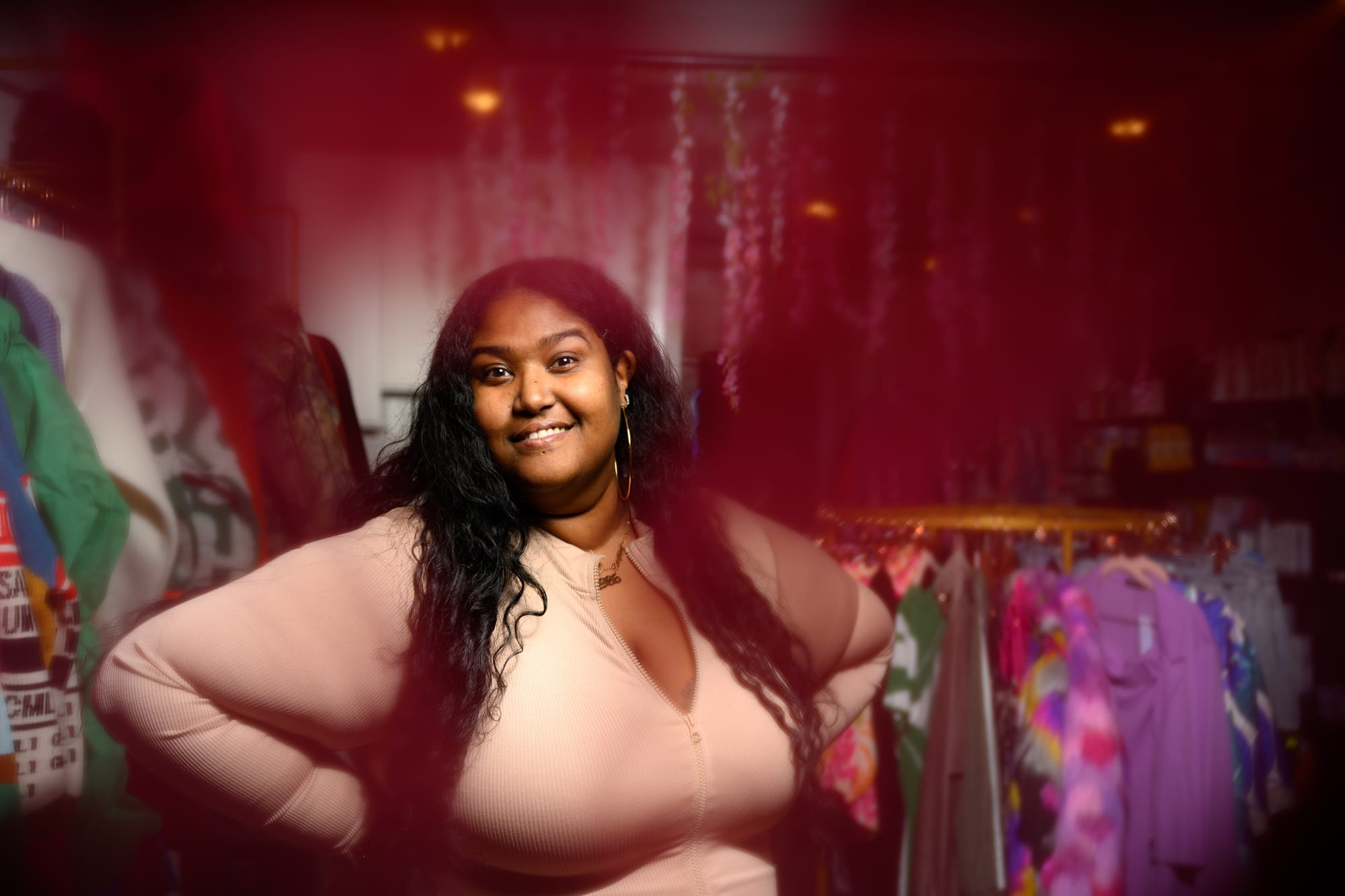 Left: Clothes circle a rack at The Blended Boutique on West Girard Avenue. Right: Sierra Merroro, co-owner of The Blended Boutique. CREDIT: Kriston Jae Bethel for The Philly Download