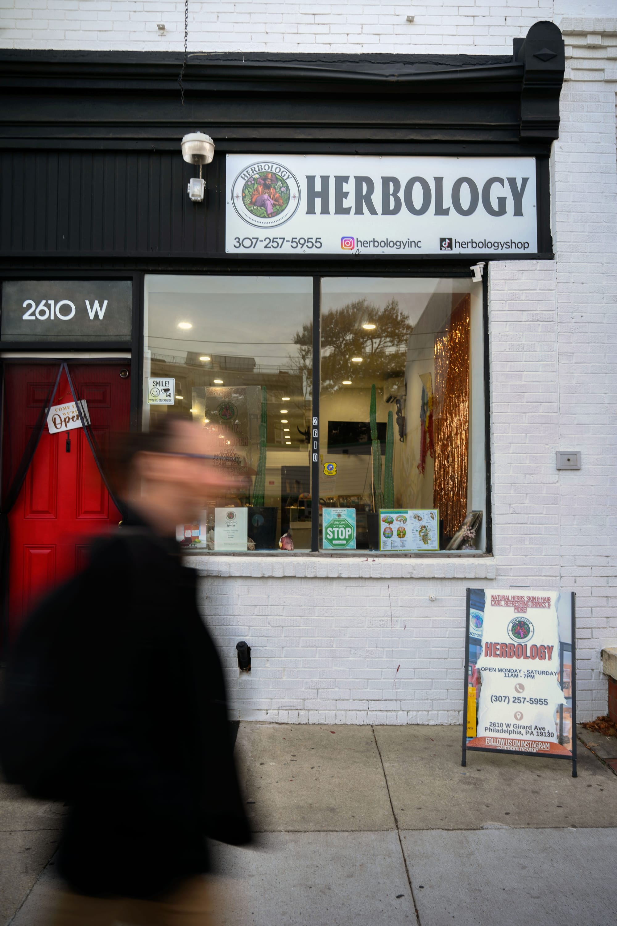 Left: A pedestrian walks past Herbology on Girard Avenue in the Brewerytown neighborhood. Right: Flor de Manita at Herbology. CREDIT: Kriston Jae Bethel for The Philly Download