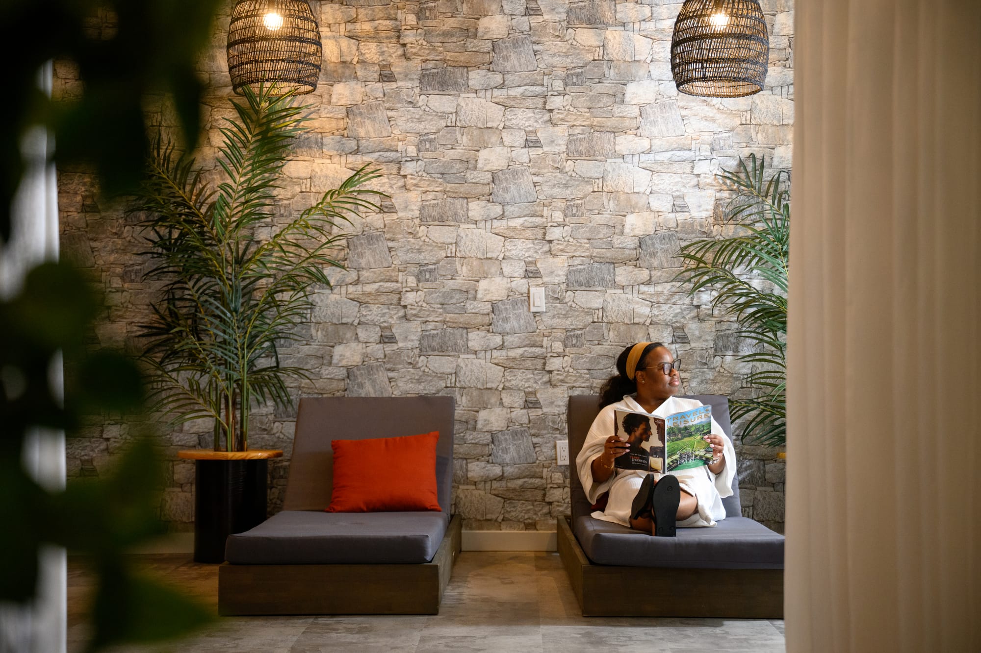 A guest sits in the lounge at Remedy Spa & Wellness on North 29th Street in the Brewerytown neighborhood, Thursday, Nov. 20, 2025. CREDIT: Kriston Jae Bethel for The Philly Download