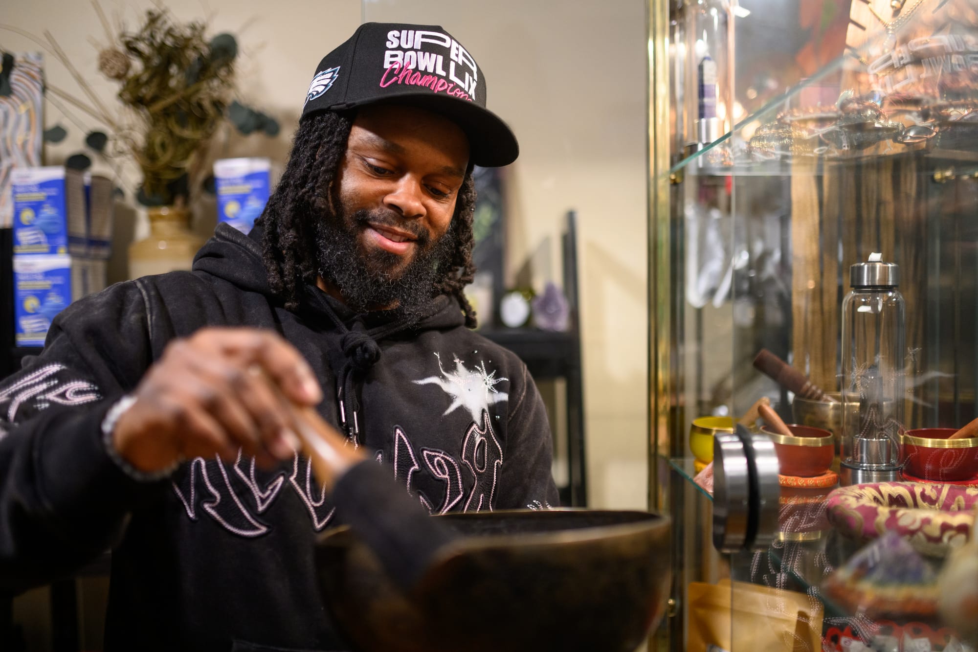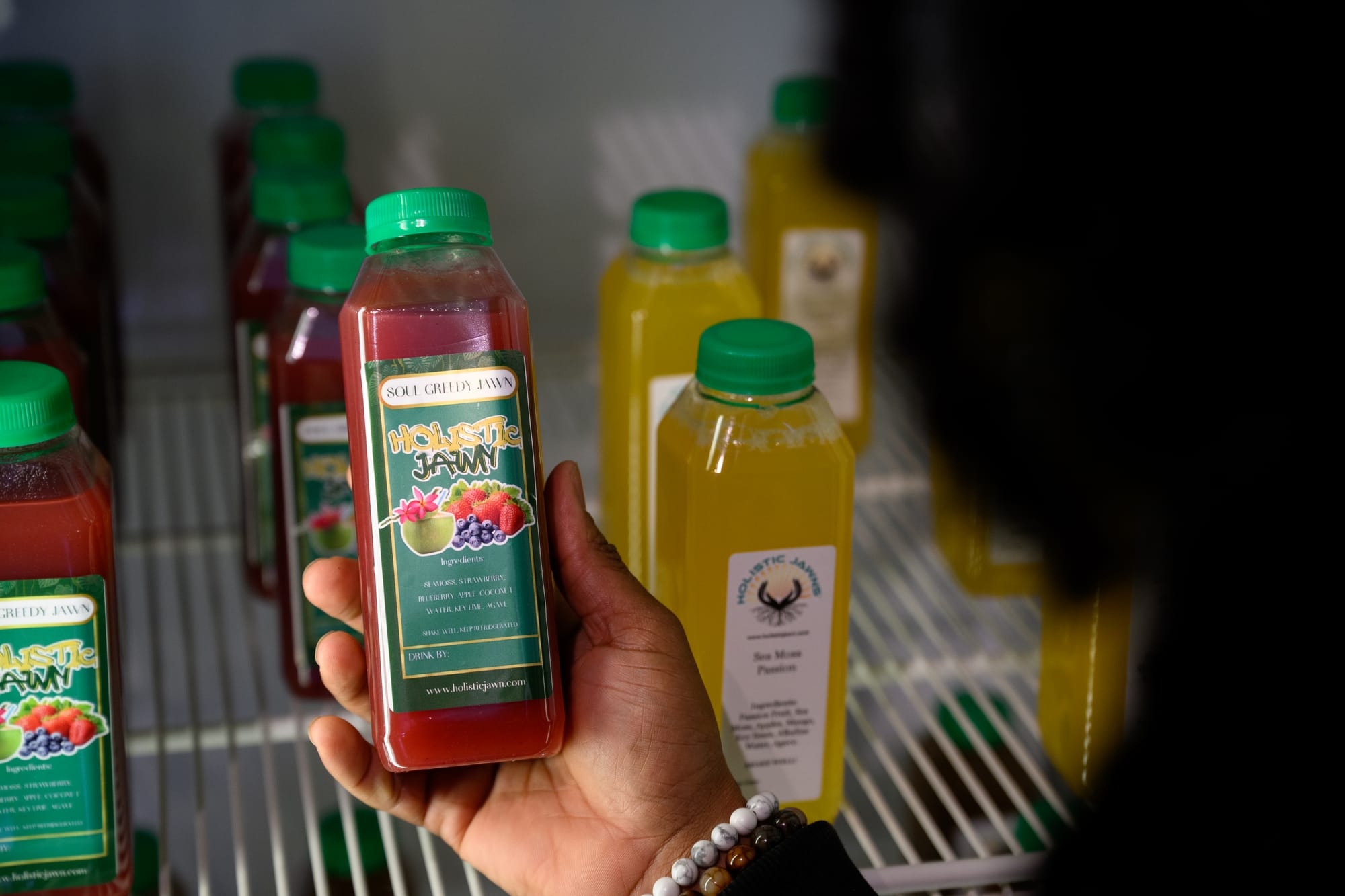 Left: Employee Solomon El holds a singing bowl. Right: Sea moss juice at Holistic Jawn. CREDIT: Kriston Jae Bethel for The Philly Download