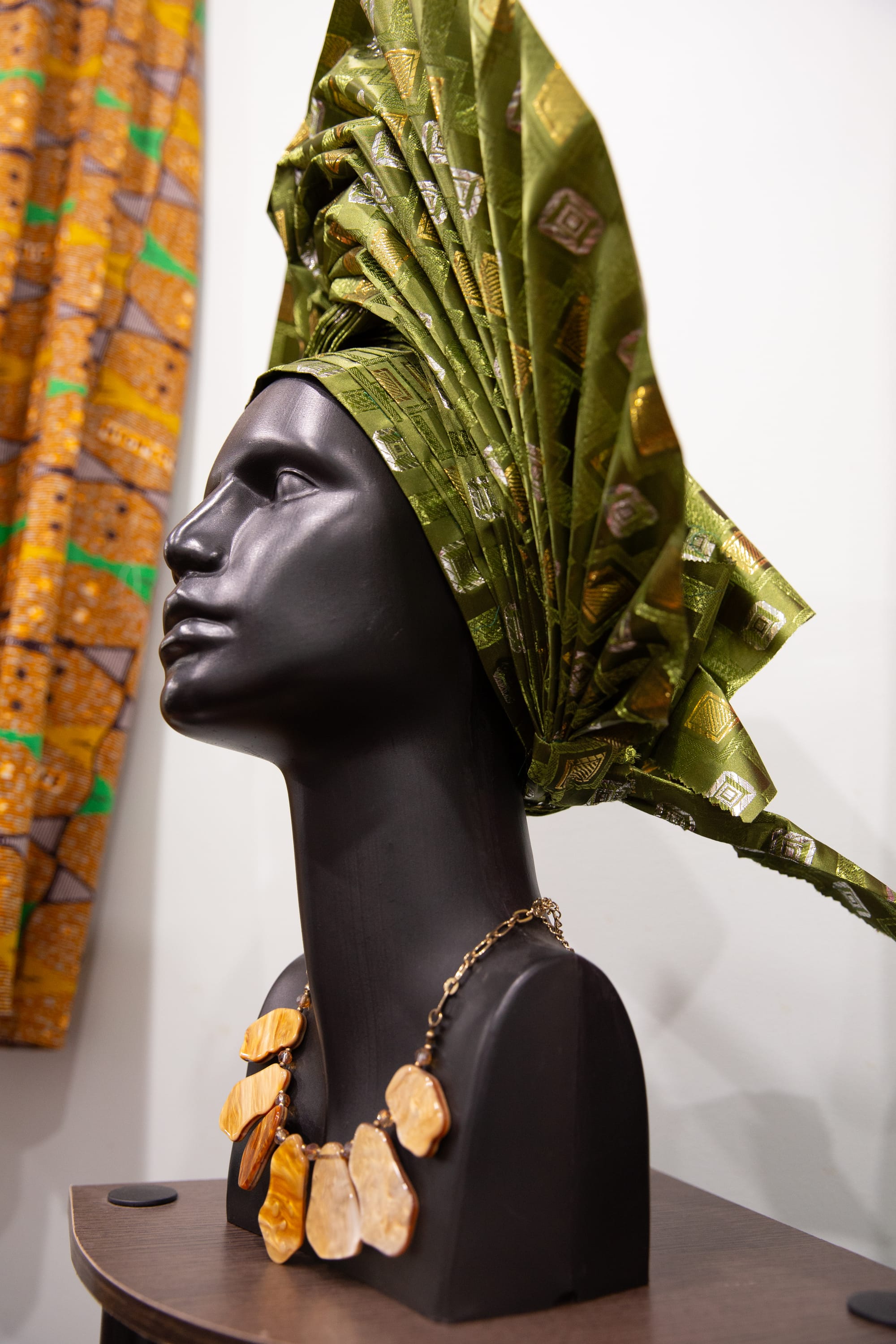 Left: African fabrics from Benin, Togo, and Nigeria tucked into cubbies at Patricia Designs. Right: Detail of a green head scarf wrapped at Patricia Designs. Credit: Holli Stephens for The Philly Download