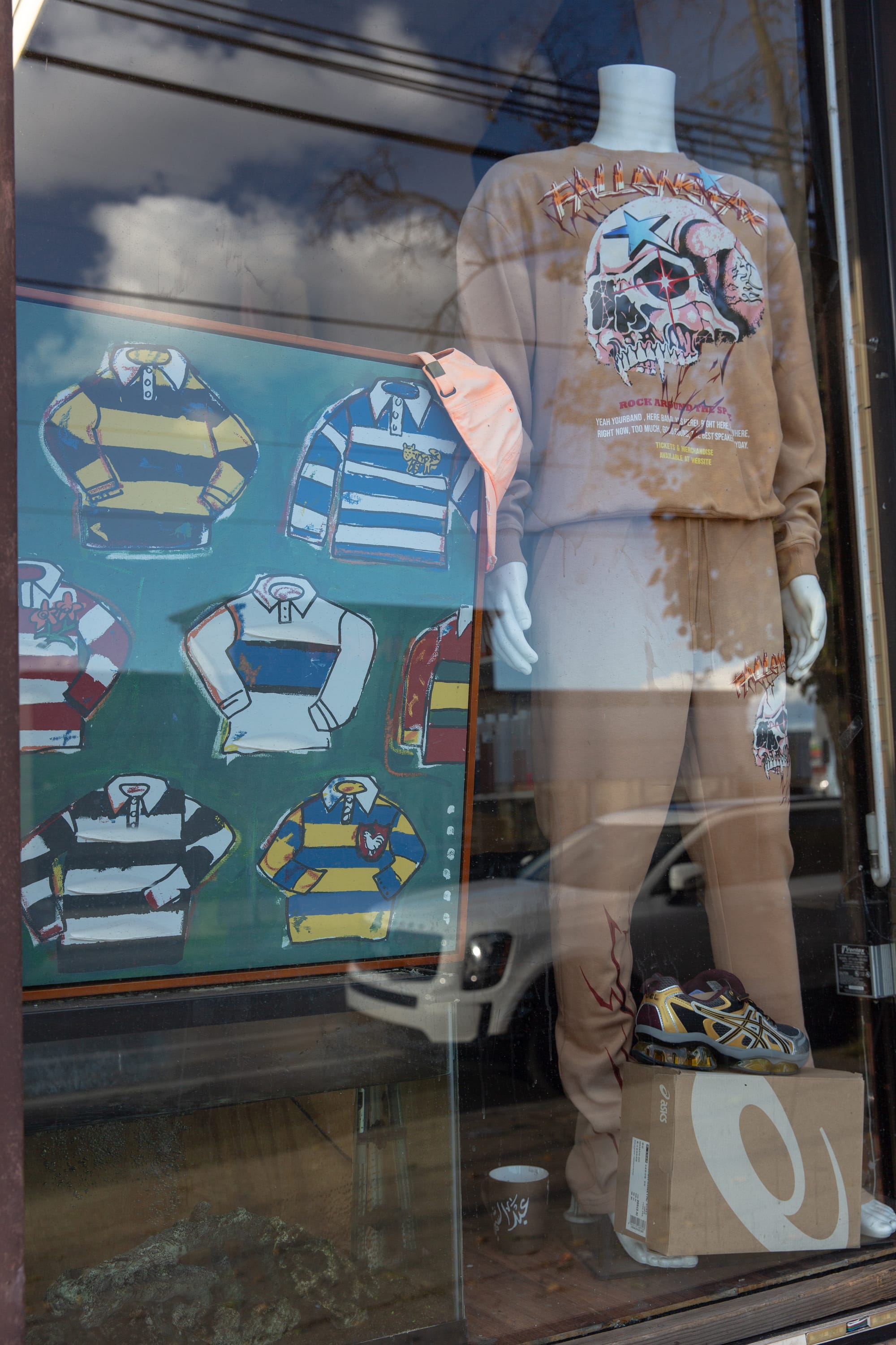 Left: Window display Da Basement Right: A local shopper walks by Da Basement, an African-American and Muslim-Owned streetwear clothing store on Woodland Avenue. Credit: Parikha Solanki for The Philly Download
