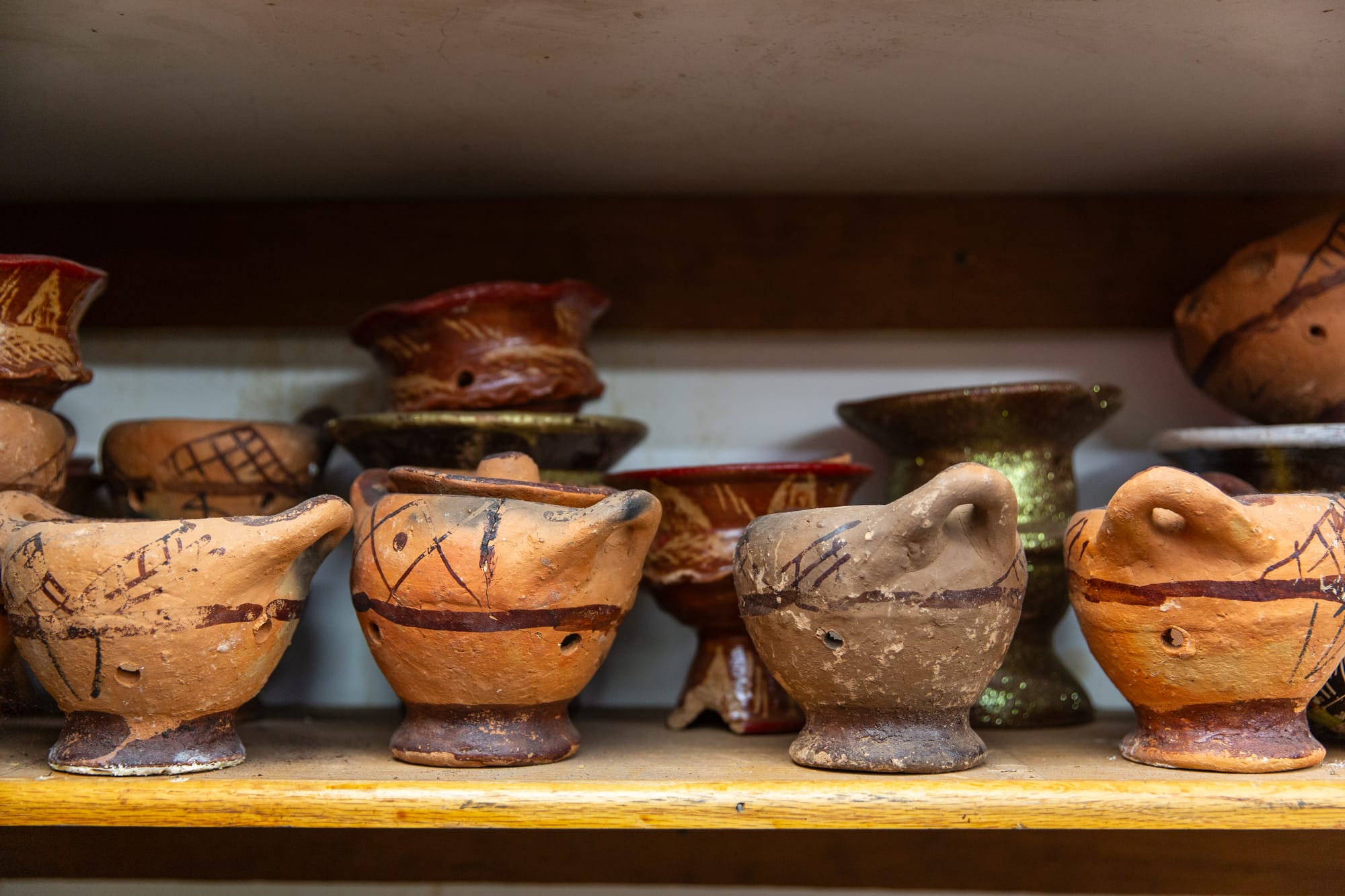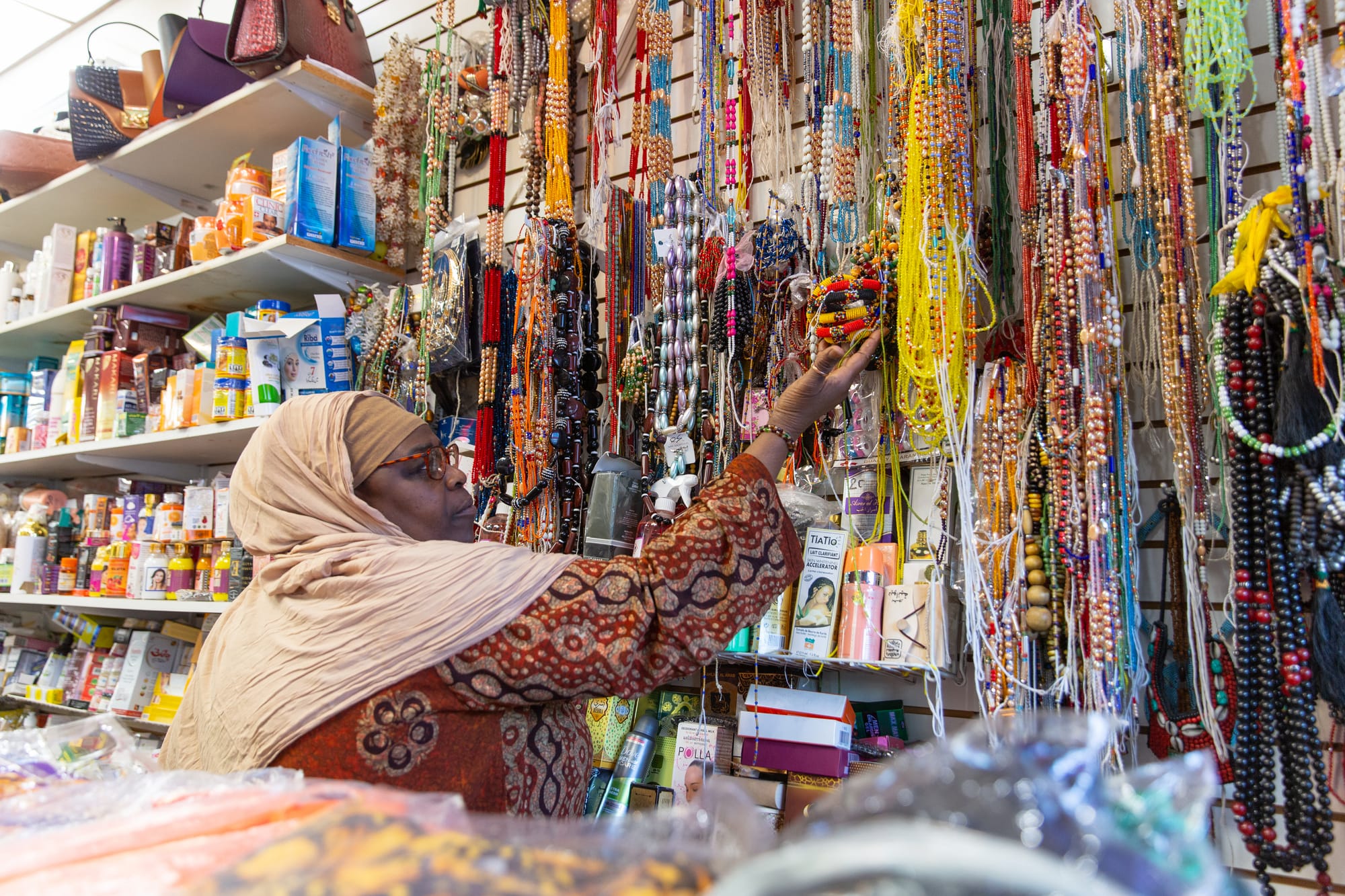 Left: A shopkeeper arranges beads and bracelets at Benegelema and Siri Bana African Market. Right: Handmade pottery at the Ivorian-owned African clothing and grocery store on Woodland Ave in the Africatown neighborhood. Credit: Parikha Solanki for The Philly Download.