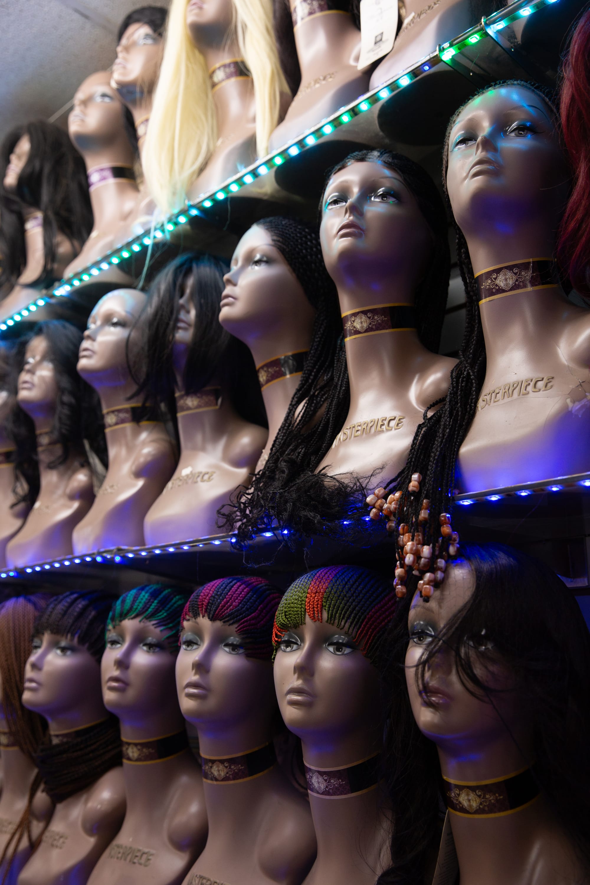 Left: Abayas, which are loose fitting dresses, are on display at High Class Beauty. Right: Different wigs on display at High Class Beauty, a Liberian, Woman, and Muslim-owned boutique in the Africatown neighborhood. Credit: Holli Stephens for The Philly Download