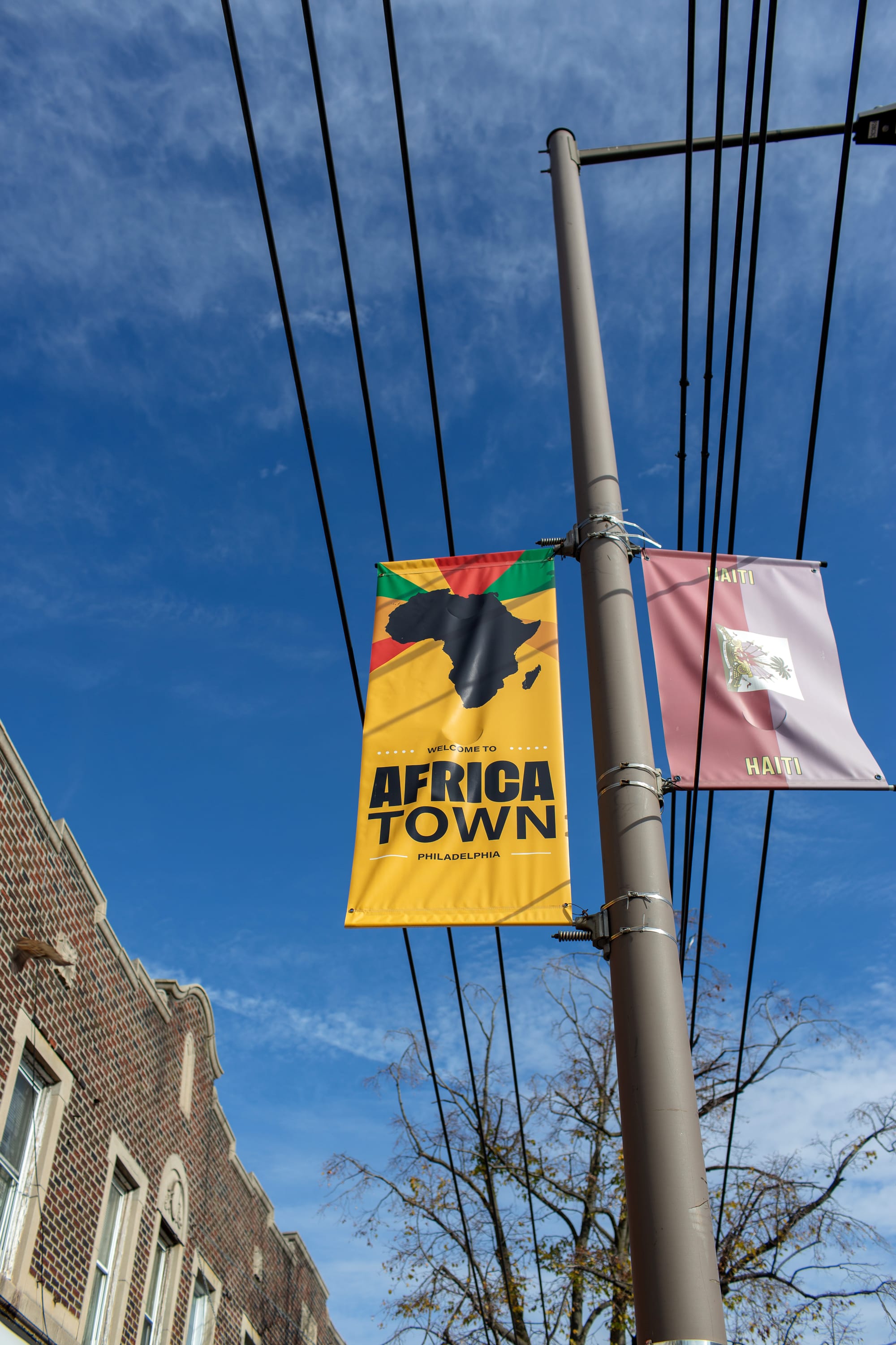 Left: A mural in the Africatown neighborhood. Center: Beads at Benegelema and Siri Bana African Market. Right: Flags featuring the Africatown neighborhood and Haiti along Woodland Avenue. Credit: Parikha Solanki for The Philly Download
