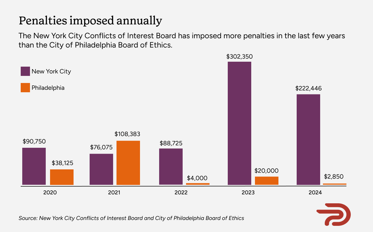 Compare that to New York City. The Conflicts of Interest Board there can levy fines of up to $25,000 per violation and order disgorgement of any financial gain. In practice, the city routinely imposes penalties of $7,250, $10,000, $22,500, and $25,000 on individual public servants. Philadelphia's statutory ceiling is New York's floor.